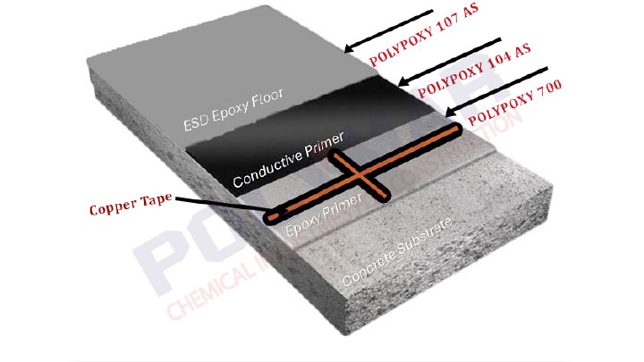 Anti-Static Epoxy Flooring System From Polymar: POLYPOXY 700, POLYPOXY 104, POLYPOXY 107, Copper Tape.